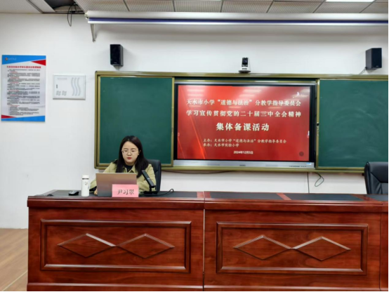 为深入学习宣传贯彻党的二十届三中全会精神,全面落实全国教育大会精神,持续推进习近平新时代中国特色社会主义思想铸魂育人。12月6日,天水市委教育工委、市教育局依托天水市大中小学思政课一体化建设指导委员会,开展全市中小学思政课教师集体备课活动,我校马克思主义学院尹习翠老师受邀作党的二十届三中全会精神的宣讲。在主会场参加活动的有天水市小学“道德与法治”分教学指导委员会部分成员、全市小学道德与法治课教师代表、市实验小学部分党员教师50余人,线上参会的是全市小学道德与法治课教师,共2200余人在线观看直播参与活动。本次活动由天水市小学“道德与法治”分教学指导委员会主任委员、天水市实验小学副校长妥金录主持。