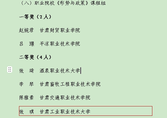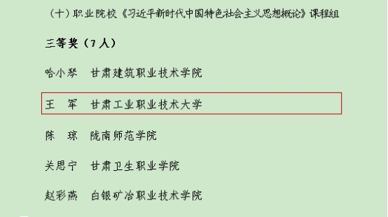近日,中共甘肃省委宣传部、省委教育工委发布了《关于对第三届甘肃省大中小学思政课教师“大比武”教学展示活动拟获奖名单进行公示的公告》,我校马克思主义学院教师张琪获得职业院校《形势与政策》课程组二等奖,王军获得职业院校《习近平新时代中国特色社会主义思想概论》课程组三等奖,充分展现了我校思政课教师队伍的良好风貌和教学水平。