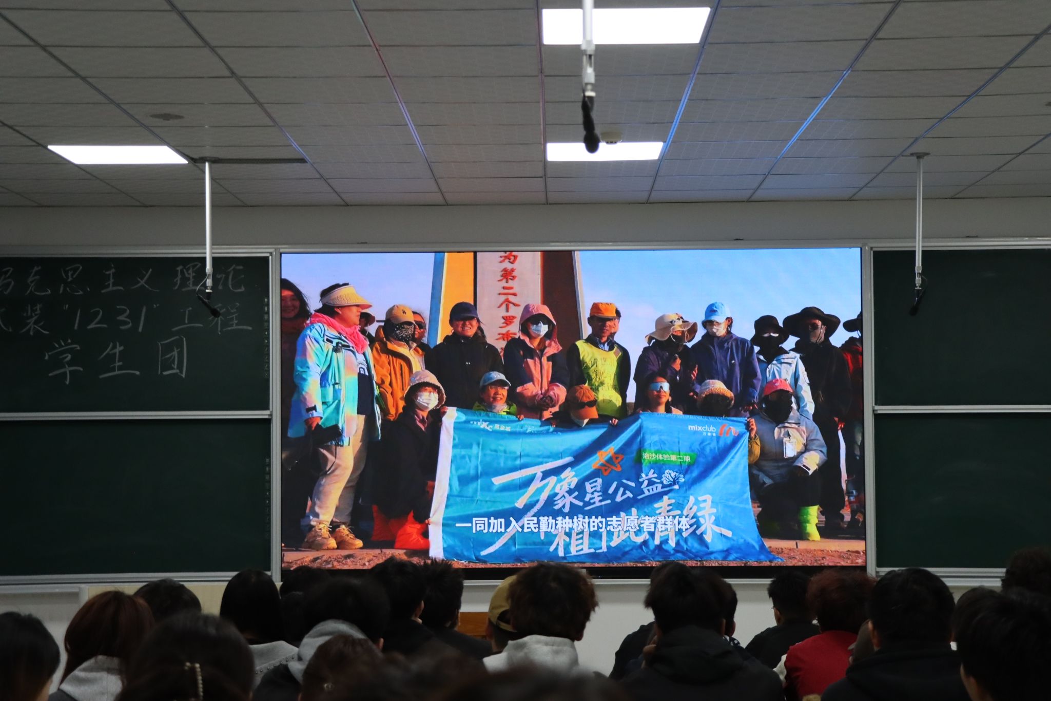 理论讲解结束后,全体成员共同观看了民勤治沙造林的纪实视频。画面中,茫茫沙漠边缘,一代代治沙人数十年如一日,在“确保民勤不成为第二个罗布泊”的誓言下,用双手种下梭梭树,用汗水浇灌绿色希望。从一棵树到一片林,从一个人到一群人,他们将个人理想深深扎根于生态保护的国家大计之中,用青春和坚守诠释了“以青春之我,担时代之责”的深刻内涵。