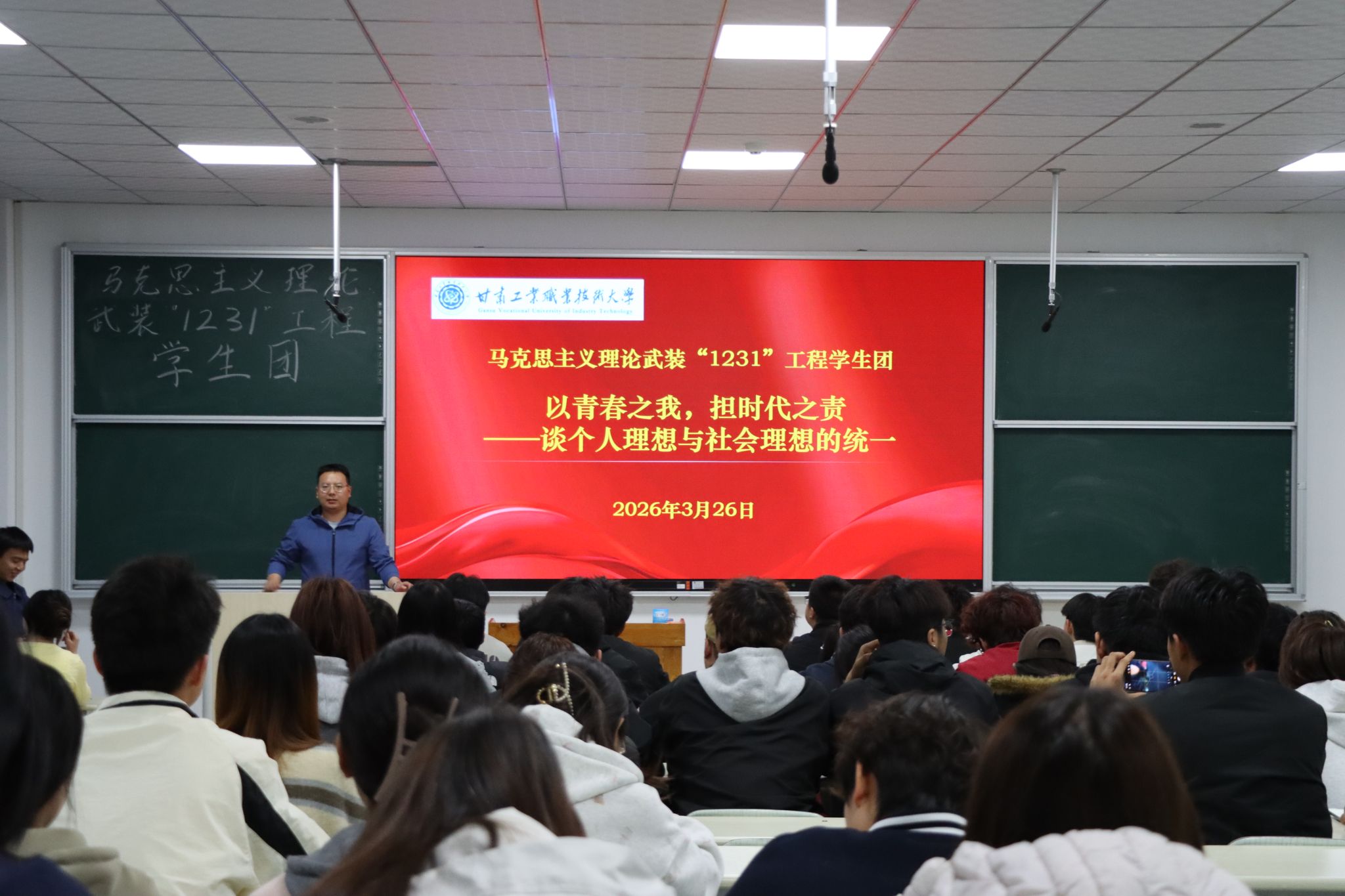 3月26日,马克思主义理论武装“1231”工程学生团在阶梯1教室举办《以青春之我,担时代之责——谈个人理想与社会理想的统一》专题学习活动。全体学生团成员参加学习,通过理论研讨与影像观摩相结合的方式,深刻领悟青年使命与时代担当的内在统一。