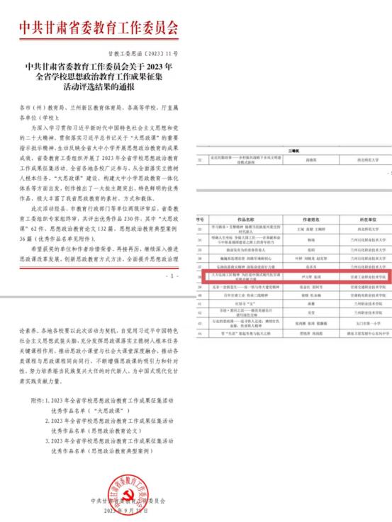 为深入学习贯彻习近平新时代中国特色社会主义思想和党的二十大精神,贯彻落实习近平总书记关于“大思政课”的重要指示精神,反映全省大中小学开展思想政治教育的成果成效,省委教育工委组织开展了2023年全省学校思想政治教育工作成果征集活动。马克思主义学院教师尹习翠、张琪的作品名称《大力弘扬工匠精神 为打造中国式现代化甘肃实践贡献力量》在此次评选活动中获得“大思政课公开课展示活动”三等奖。
