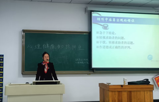 马克思主义学院心理健康教育办公室主任张艳峰以“朋辈心理辅导的技能”为主题做了专题辅导,她以什么是朋辈心理辅导开篇,通过“你是否适合做朋辈辅导员”测评,强调了作为心理工作者应该遵守的保密等工作原则,利用真实情境介绍了理性情绪疗法,借助大量心理辅导实例为心理委员教授了“非语言行为”、“倾听”、“反应”等技能,为与会成员带来了如何助人及自助的满满干货,也为我校心理健康教育打造“四位一体”的工作体系打下坚实基础。
