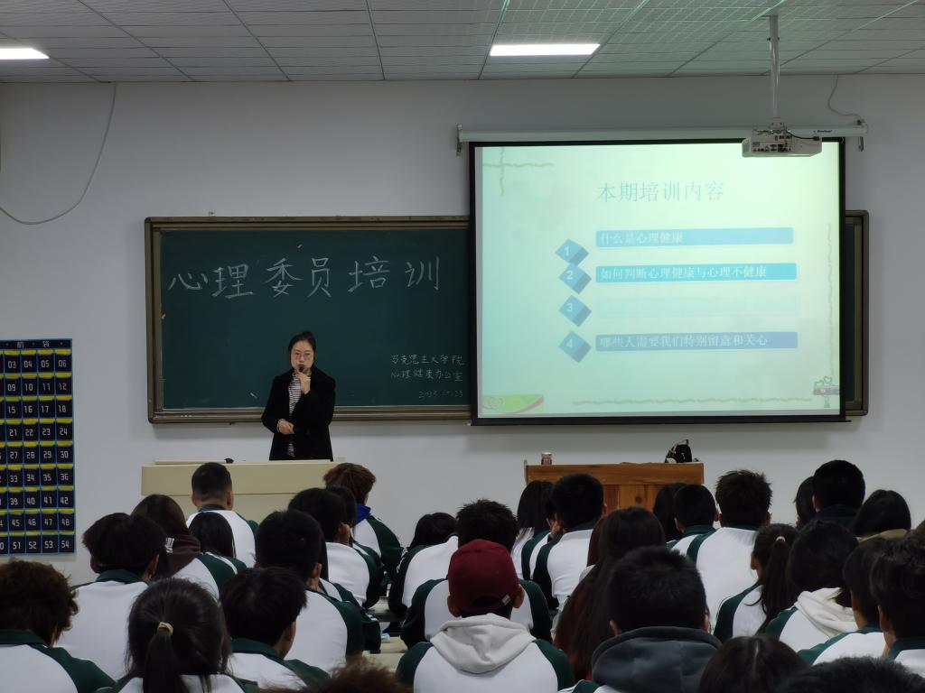 为提高班级心理委员工作能力与水平,完善我校心理健康教育工作体系,马克思主义学院心理健康教育办公室于10月25日下午四点至六点在实训楼3号多媒体教室举行2023级班级心理委员及心灵护卫队全体成员专题培训,培训主题为“关注健康,助人自助”。