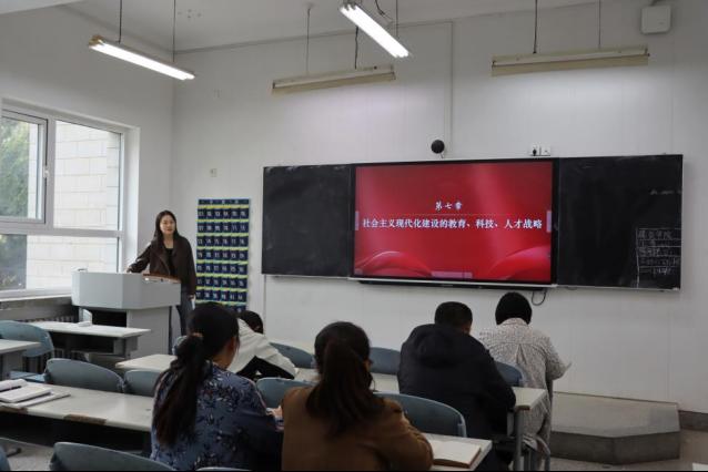 本次集体备课会采用分章节研讨的方式进行。在第六章和第七章的备课环节中,孙丹丹老师以"社会主义现代化建设的教育、科技、人才战略"为主题,从宏观视角系统构建了教学框架。她创新性地将"两会工作报告"最新精神与教材内容有机结合,并辅以精选视频案例,对教学重难点进行了立体化解析。