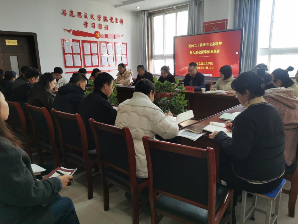 为深入学习贯彻党的二十届四中全会精神,推动全会精神融入思政教育教学实践,11月19日,马克思主义学院在立德楼B208会议室召开党的二十届四中全会精神融入思政课集体备课会。学校思政课指导组成员、副校长张德龙、张庆华出席会议并讲话,马克思主义学院全体思政课教师参加。史维波主持会议。
