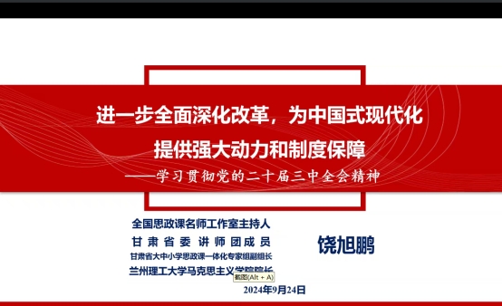 9月24日晚上,邀请兰州理工大学马克思主义学院院长、教授、博士、硕导饶旭鹏做了《进一步全面深化改革,为中国式现代化提供强大动力和制度保障》报告。我校和甘肃林业职业技术大学全体思政课教师,黄彬名师工作室、郭三龙工作室全体骨干成员参加培训。