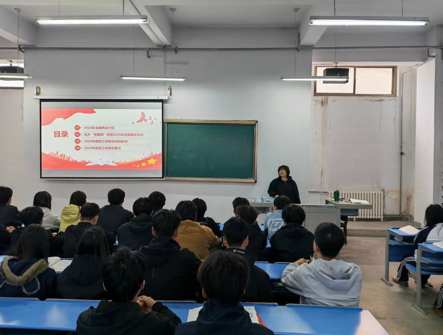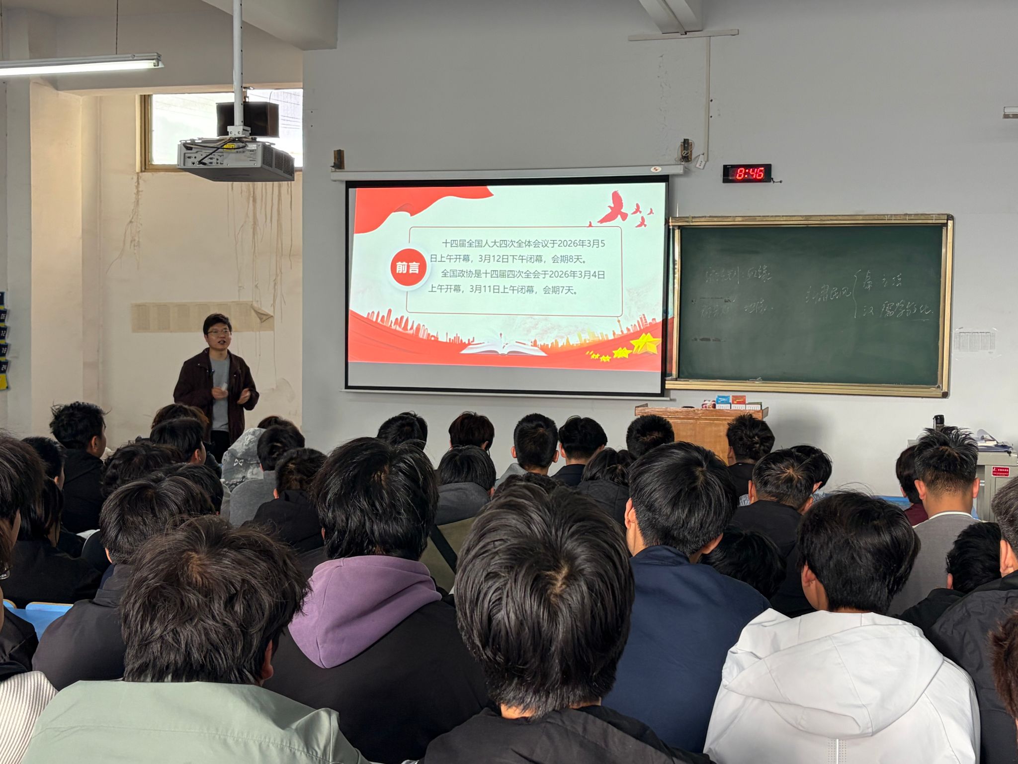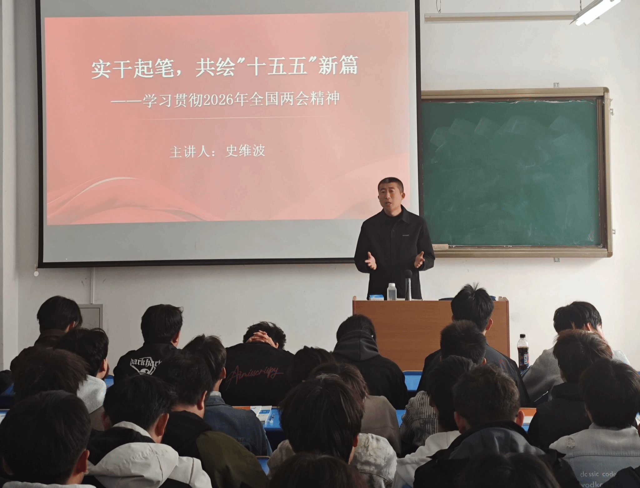 课堂上,教师紧扣2026年政府工作报告与“十五五”规划纲要,围绕高质量发展、新质生产力、民生保障等核心内容,详细解读中国式现代化的内涵与实践路径。通过数据解读、案例分析,直观讲解国家发展现状与未来规划,阐明两会部署对国家发展的重要意义,为中国式现代化建设凝聚共识、指明方向。同时勉励青年学子,立足专业学习,紧盯国家战略需求,在实践中锤炼本领,将个人理想融入民族复兴大局。